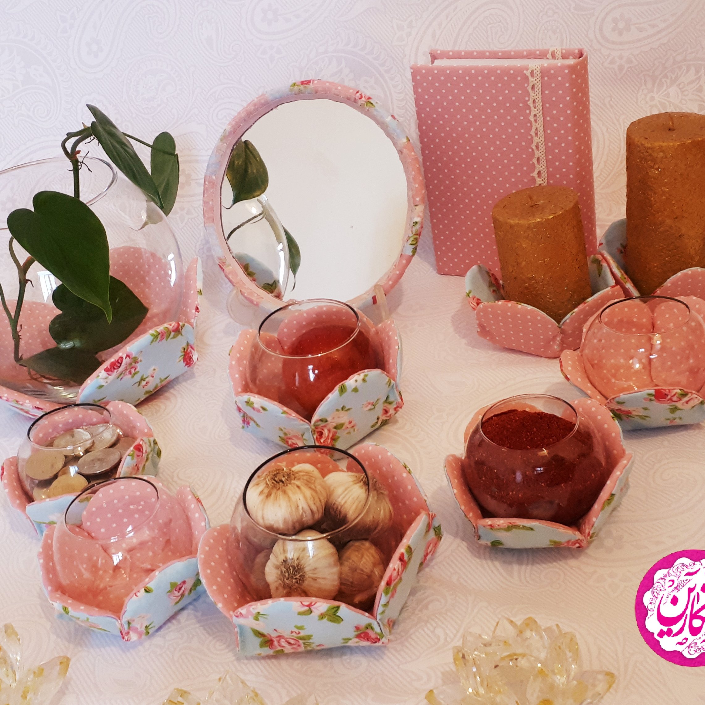 ست هفت سین مه گل این ست شامل 7 ظرف و دو جاشمعی و آینه و قرآن میباشد پارچه ایه و میتونید از پارچه های موجود دیگه هم سفارش بدید