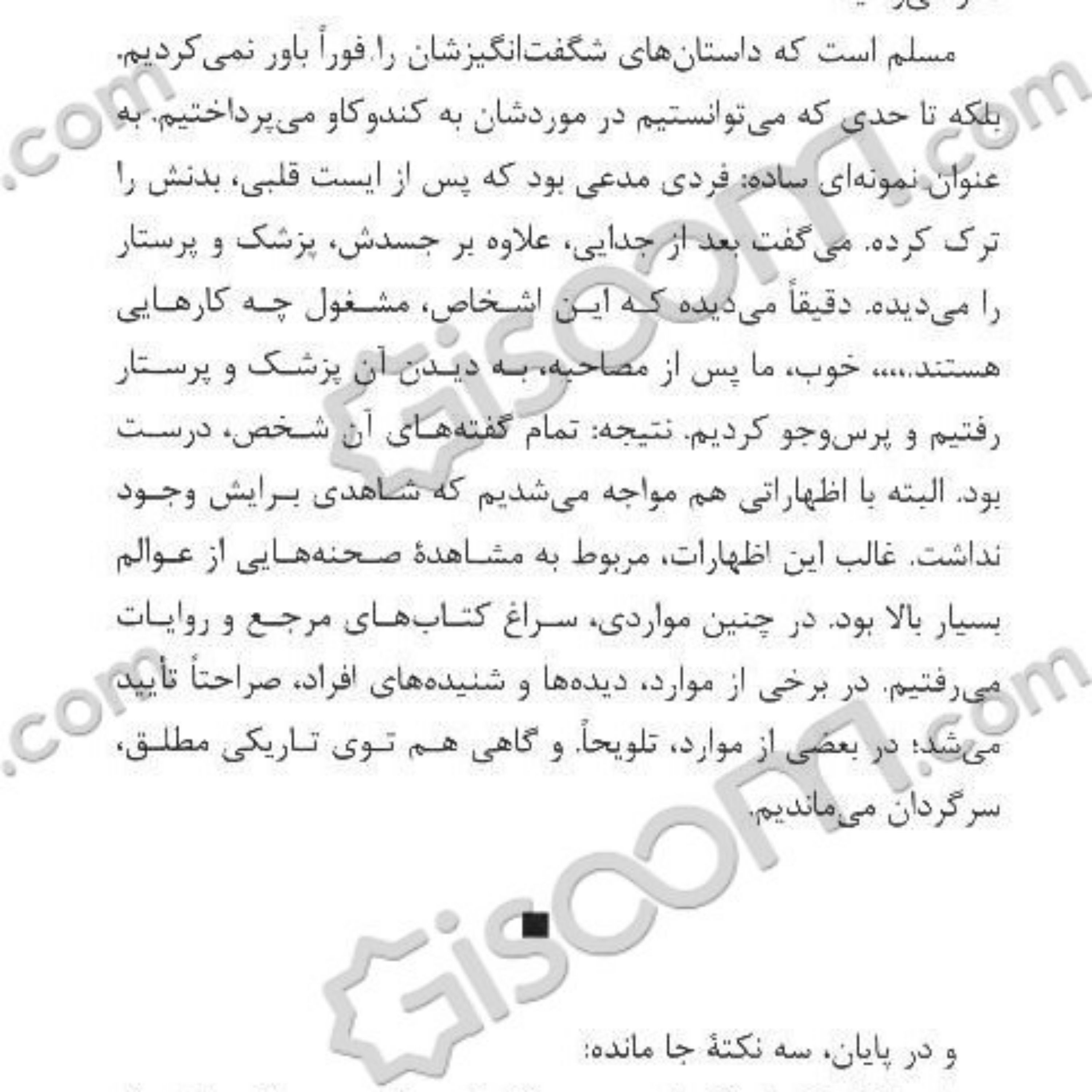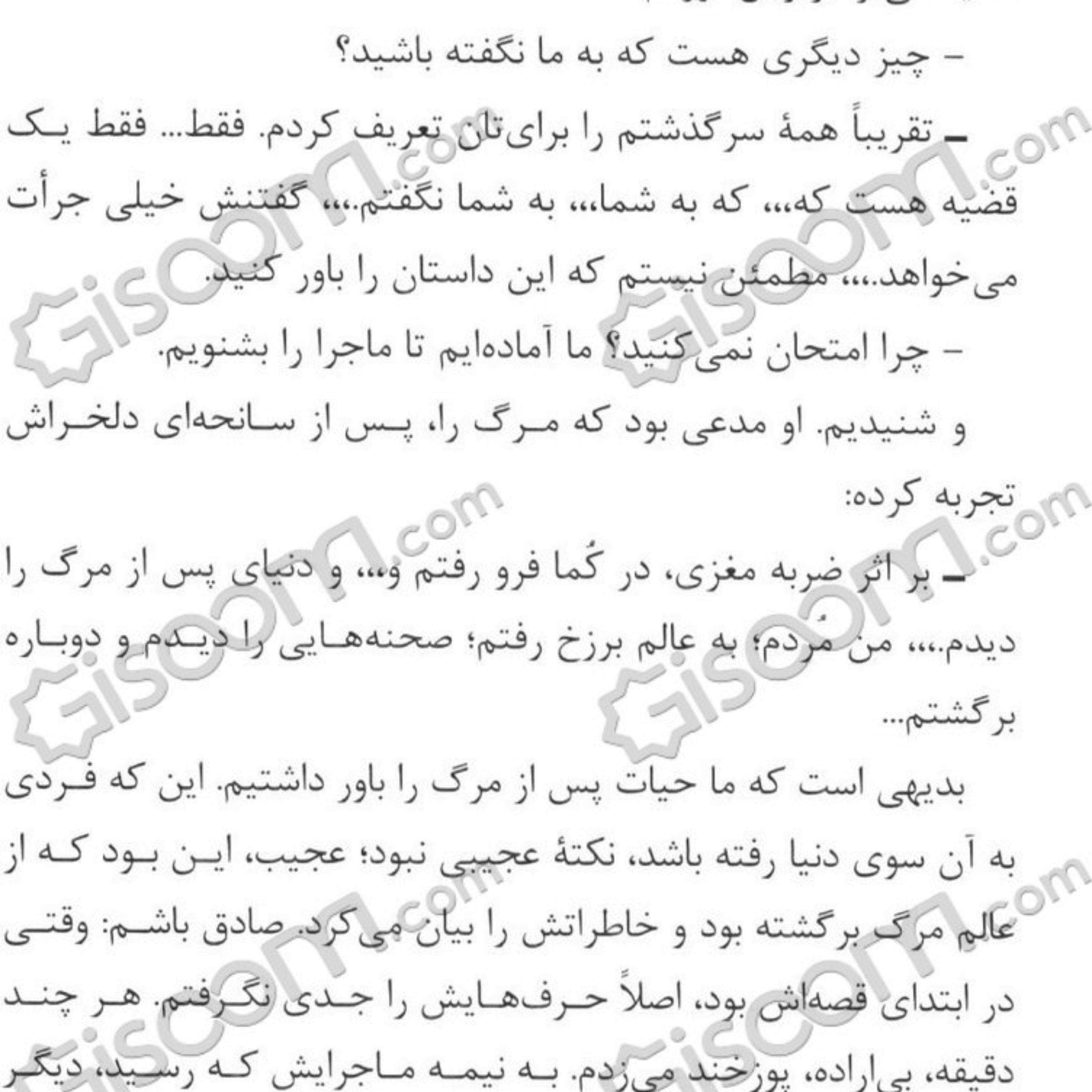 این کتاب روایت شرح حال کسانی است که مرده اند، و زندگی پس از مرگ را دیده و سپس زنده شده اند !! گزیده ای از کتاب: _ سحر، می خواهم بدانم واکنش تو،،، واکنش وجود اثیری تو در برابر جسمِ بی جانت چه بود؟ وقتی کالبدت را دیدی چه فکری کردی؟ -خوب، ابتدا، حسابی گیج شدم. مرتب از خودم می پرسیدم: “اگر او من هستم؛ پس من (منی که در بالا قرار دارم) کی هستم؟!” _ چه وضعیت عجیبی! تو داشتی با چشمانی دیگر، جسمت را نگاه می کردی. ـ بله. و احساس می کردم به دو نفر تبدیل شده ام. یکی از دو وجودم روی تختِ بیمارستان است و دیگری در بالا. و فکر می کردم چه طور چنین چیزی ممکن است! عاقبت، به یک جواب منطقی رسیدم:” فقط در یک صورت، چنین چیزی ممکن است: این که مرده باشم.” همان وقت، عمیقا درک کردم که مرده ام. ـ با درک این موضوع، خیلی وحشت کردی؟ ـ وحشت نکردم. خیلی هم خوشحال شدم. ـ خوشحال؟ ـ خوشحال. چون فهمیدم که هنوز وجود دارم، هنوز زنده ام؛ هرچند به شکلی دیگر. چون فهمیدم که هنوز از قوه بینایی، شنوایی و بویایی برخوردار هستم، هرچند کالبد مادی نداشتم.،،،، علاوه بر این، دریافتم که مرگ، چیز خوبی است. حداقل برای من خیلی خوب بود. به سه دلیل: یکی این که از آن دردهای شدید نجات پیدا کرده بودم. (به قدری دور از درد، هر دردی، بودم که نمی توانم شرح دهم.) دلیل دیگر، آرامش عجیبی بود که داشتم.،،، و دلیل آخر: حظِ زیادی که به خاطر بی وزنی نصیبم شده بود. ...