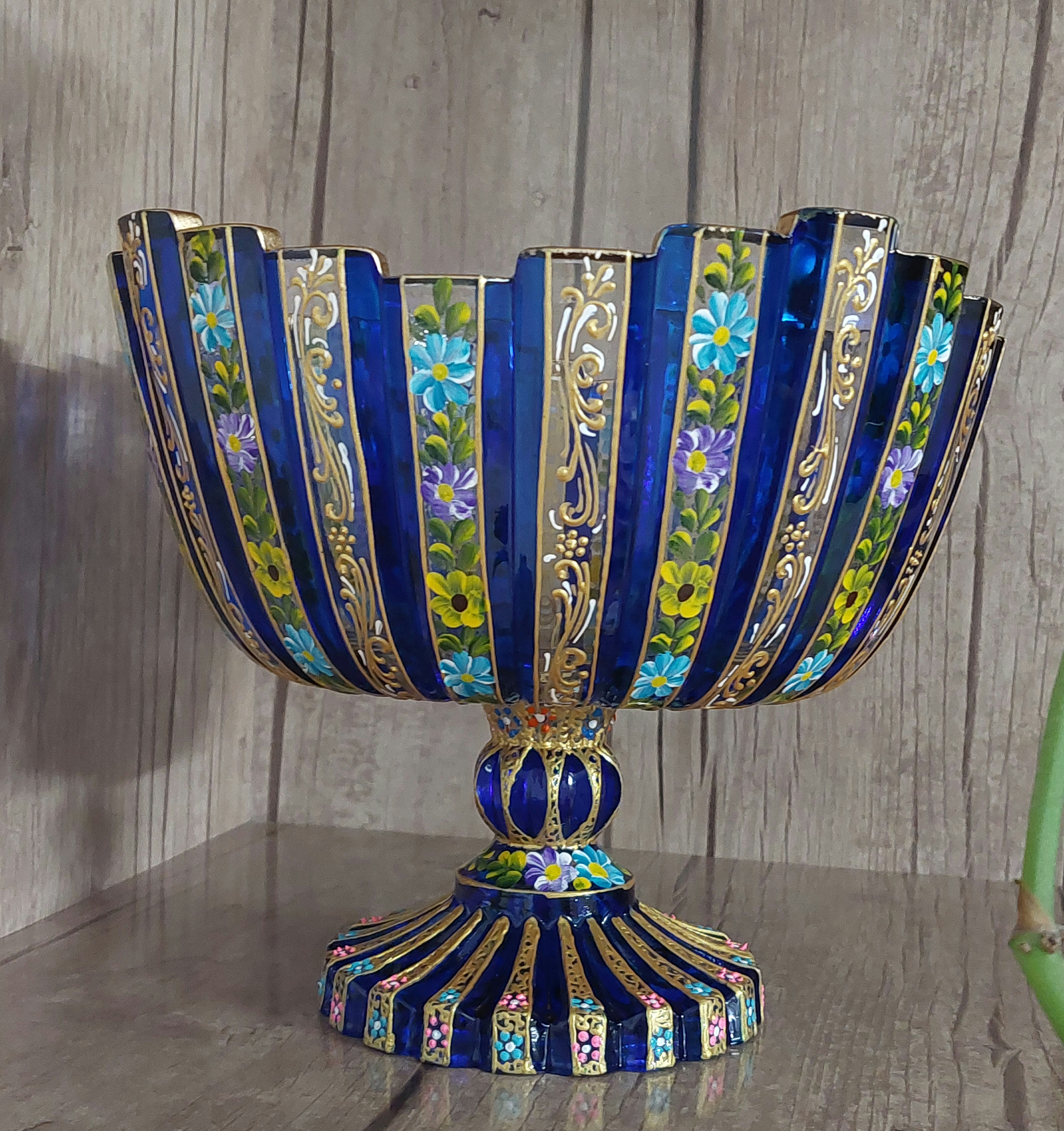 کاسه پایه دار بلور نقاشی شده، کاری منحصر به فرد که به طور انحصاری توسط گالری پرند در سه رنگ آبی، قرمز و سبز نقاشی می شود و تمامی رنگ و طرح های آن کارِ دست می باشد. این محصول کاملا قابل شست و شوی معمولی می باشد و علاوه بر استفاده ی دکوری می تواند بهترین گزینه برای پذیرایی از میهمانان، سفره ی هفت سین و شب یلدای شما باشد. همچنین می تواند کادویی منحصر به فرد برای دوستان و عزیزانتان باشد