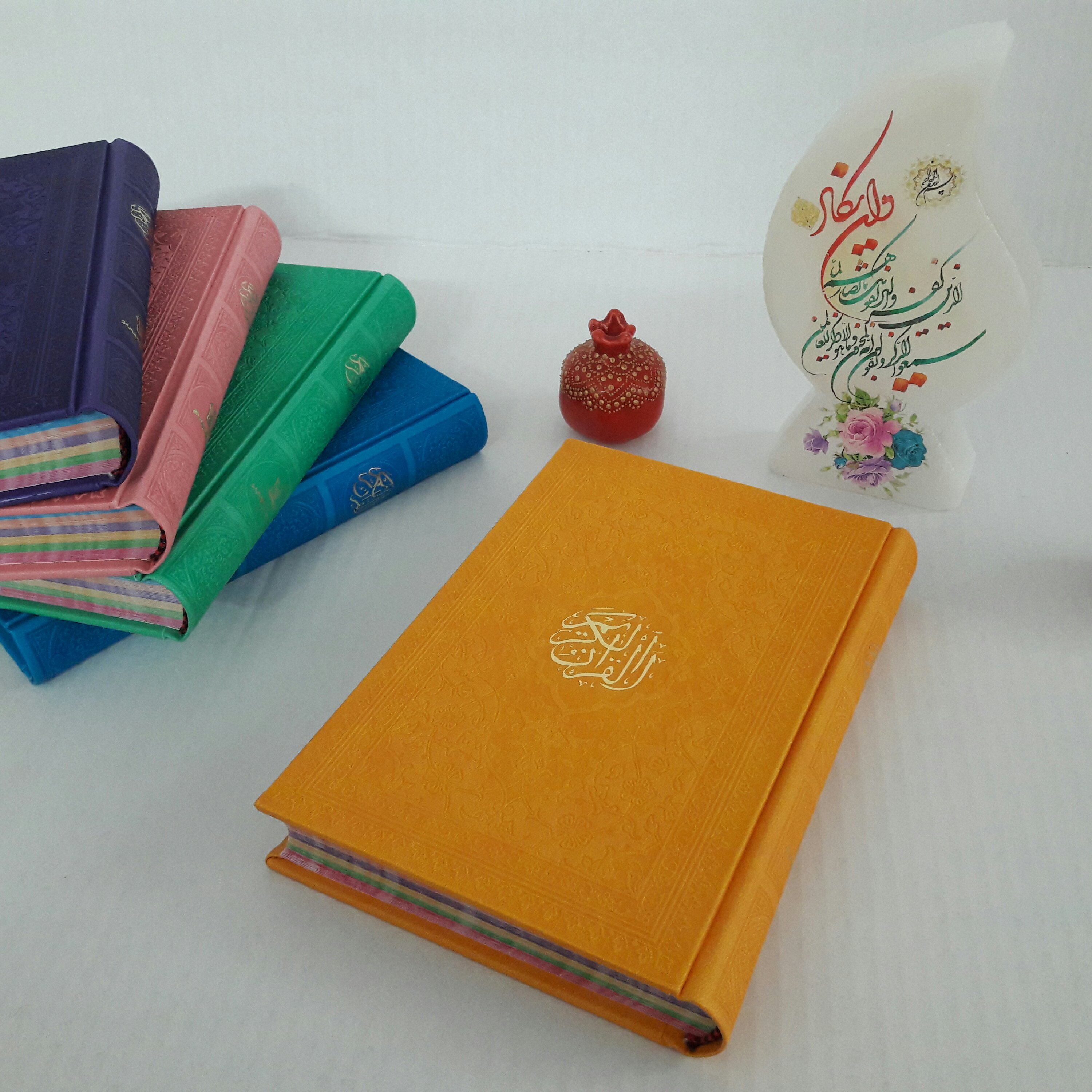 قرآن رنگی قطع رقعی رنگ زرد قرآن قطع رقعی 22*15 انتشارات امام رضا(ع) صفحات رنگی ،جلد چرمی ترمو رنگ زرد