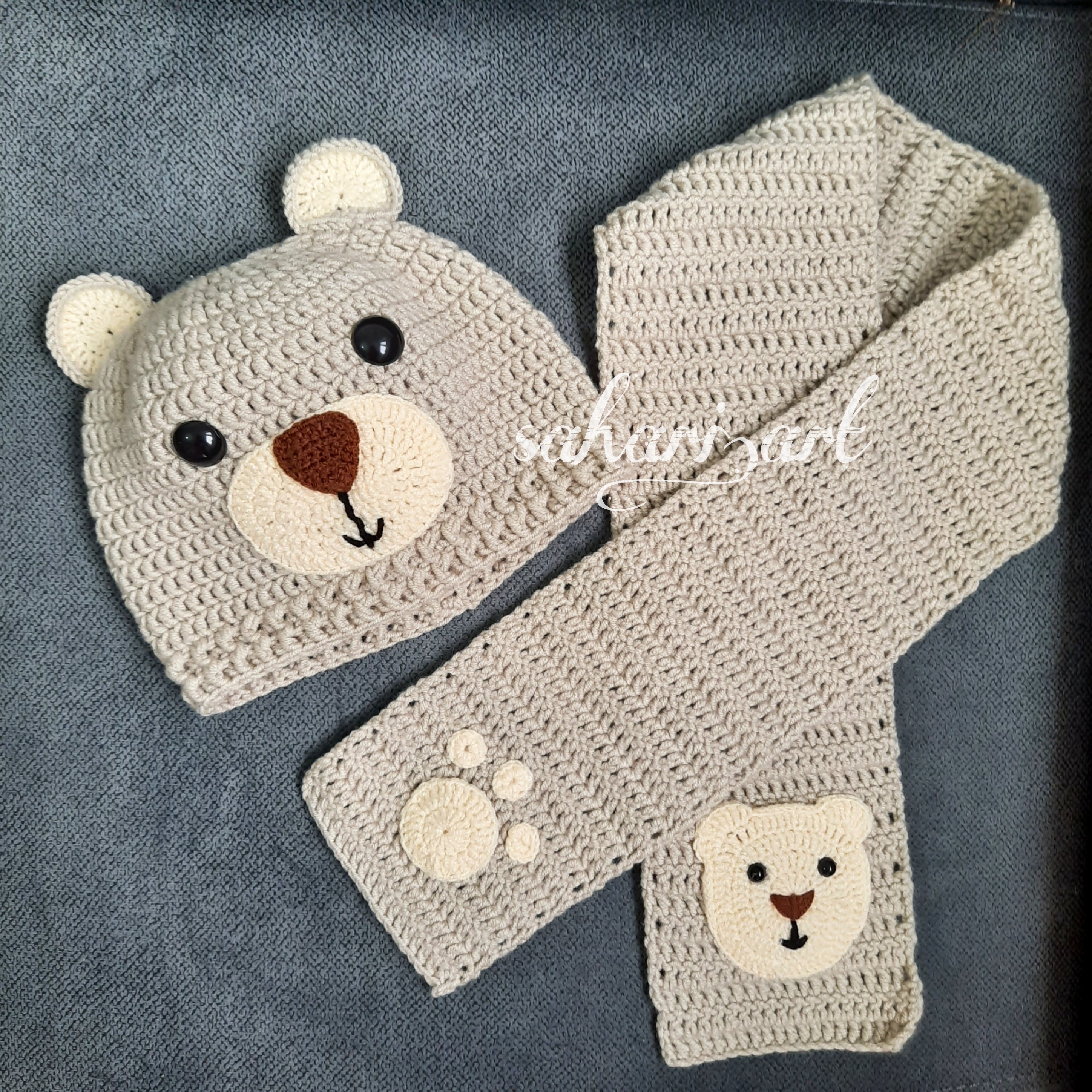 ست شال و کلاه طرح خرس بافته شده با دست کاموا گرم و لطیف مناسب بچه ها با رنگ عالی