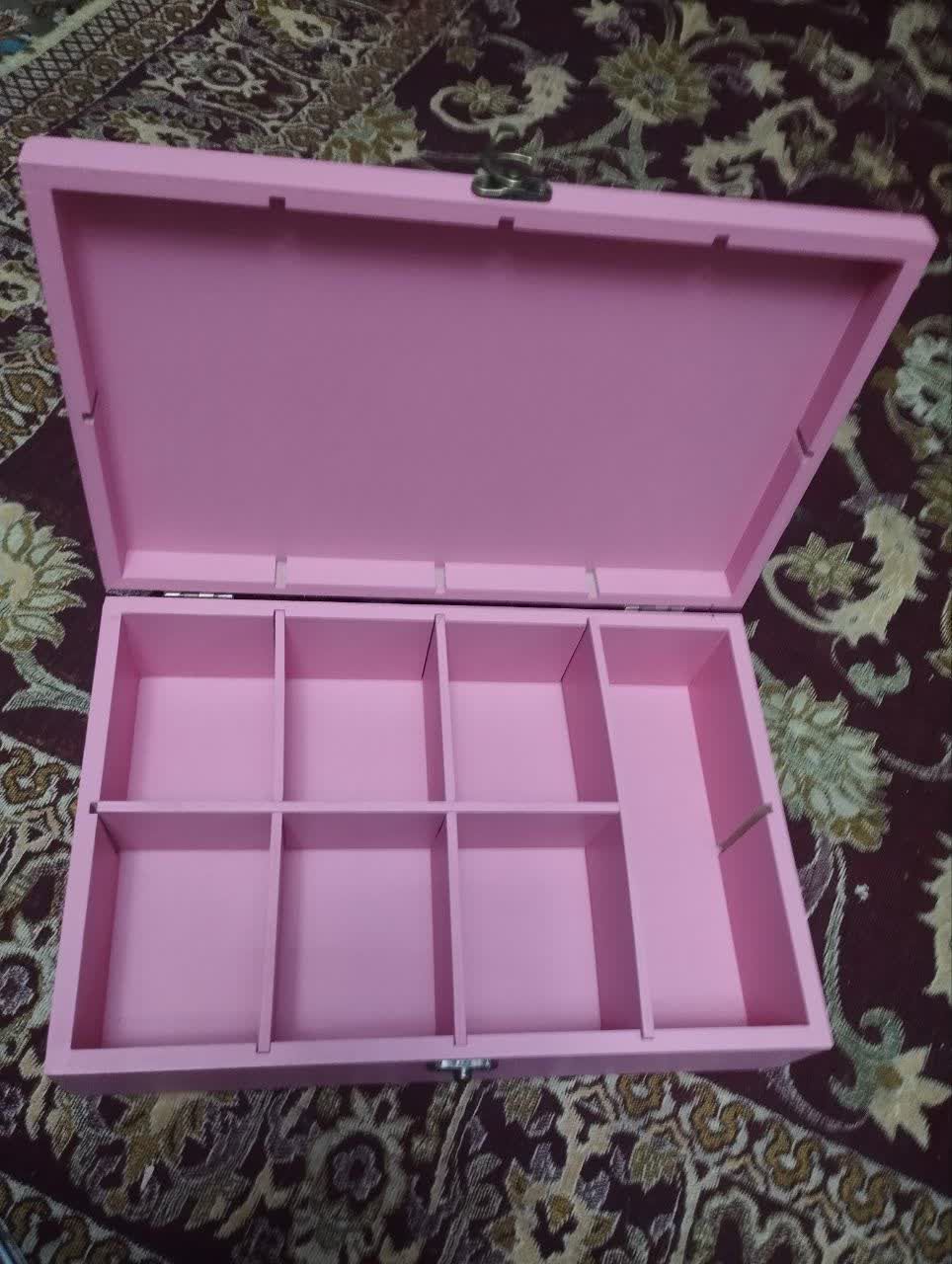 جعبه خیاطی چوبی داخلش تقسیم بندی داره برای نظم دهی به لوازم نقاشی شده تماما کار دست رنگ ثابت و ضد آب