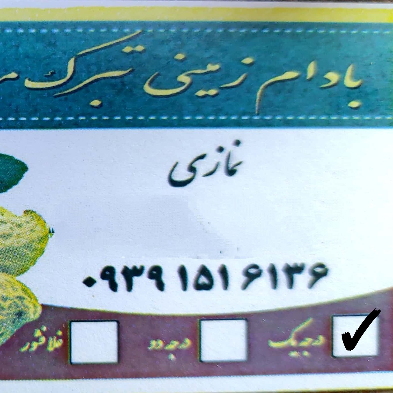 سلام من بادام زمینی از تبرک مغان خریداری کردم عالی بود ورضایت داشتم اقای نمازی خیلی همکاری داشتن و توضیحات خوبی داشت وخیلی صبور بودن ازشون ممنونم
