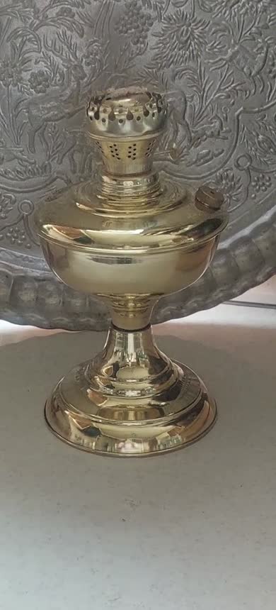 چراغ گردسوز چراغ فیتیله ای نفتی برنجی بزرگ در عکس اولین از چپ ارتفاع بدون شیشه 27سانت با شیشه 50 دورشکم چراغ حدودا45سانت نفتی قابل استفاده بسیار زیبا رنگ طلایی شیشه شاه عباسی