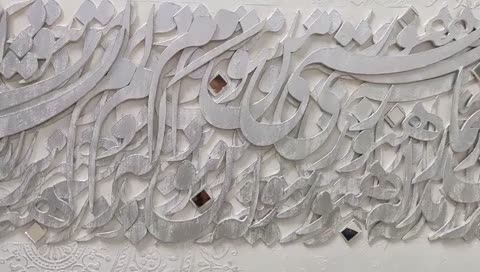 تابلو به صورت نقش برجسته با استفاده از حروف چوبی درست شده زمینه به صورت پتینه کار شده و از رنگ اکرلیک و ورق نقره ی مایع برای رنگ آمیزی کار استفاده شده کاملاً رنگ ثابت،قابل تمیز شدن با دستمال نمدار در رنگ و اندازه ی دلخواه هم قابل سفارش هست دارای قاب هم میباشد