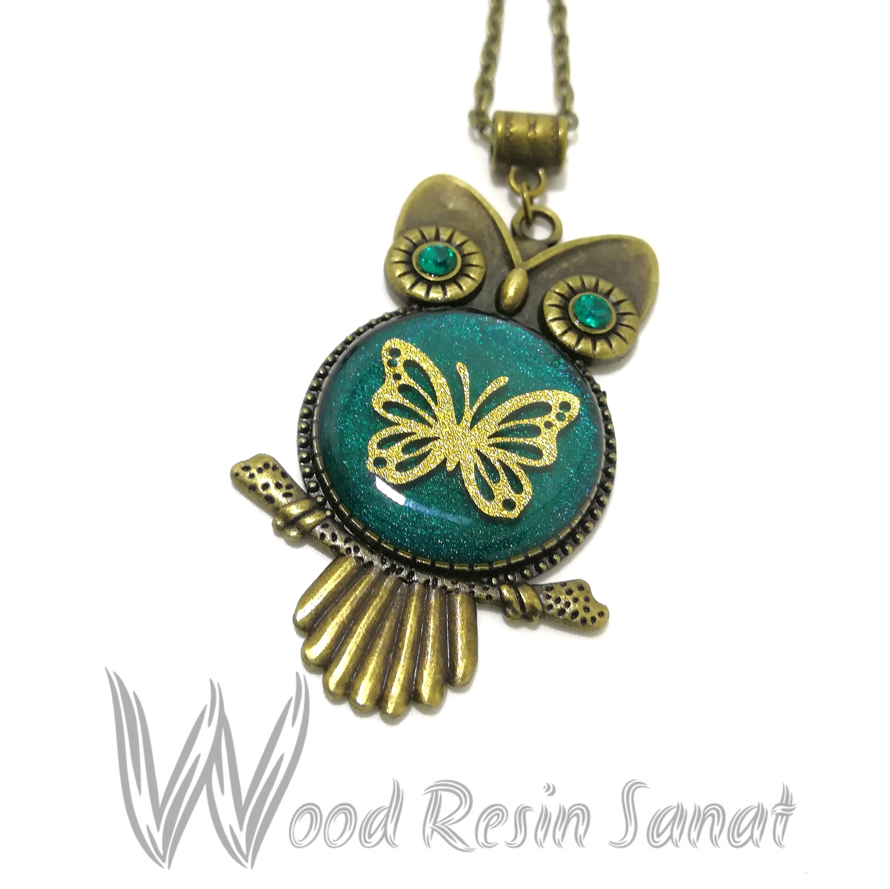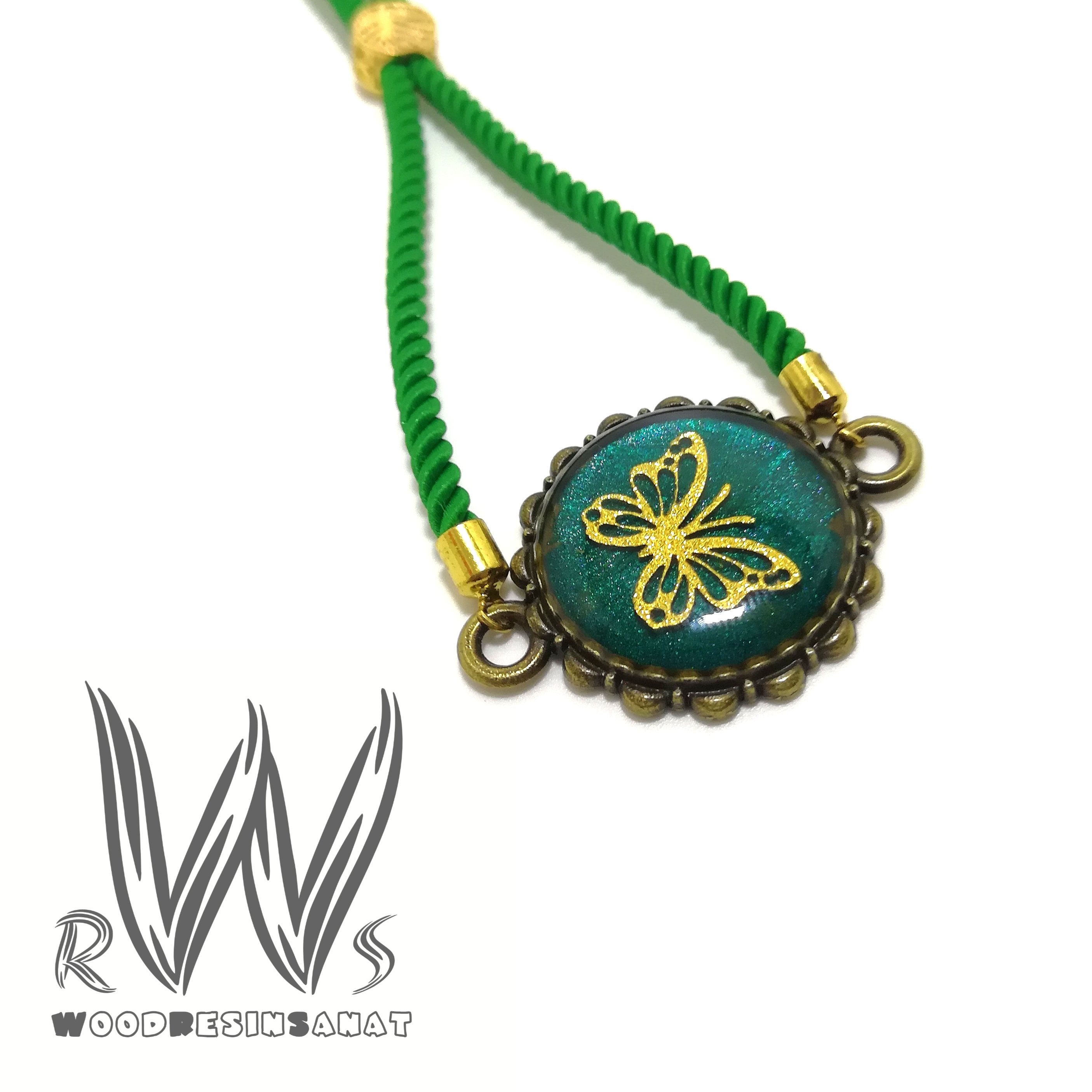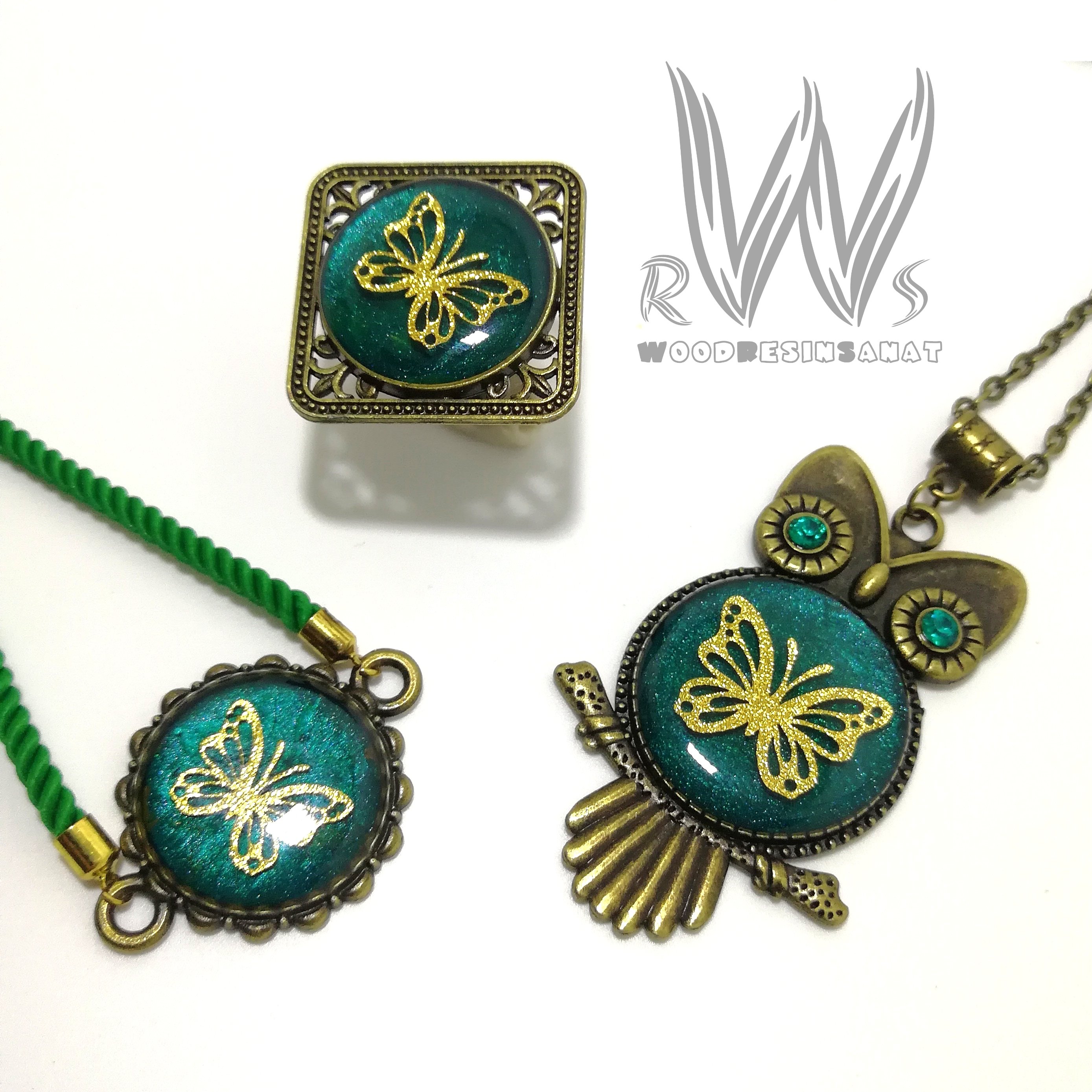 ست زیورآلات رزین طرح شاپرک 🦋 شاپرک طلایی و زمینه سبز شامل گردنبند و دستبند و انگشتر بند آسانسوری ابریشمی در رنگ های متنوع