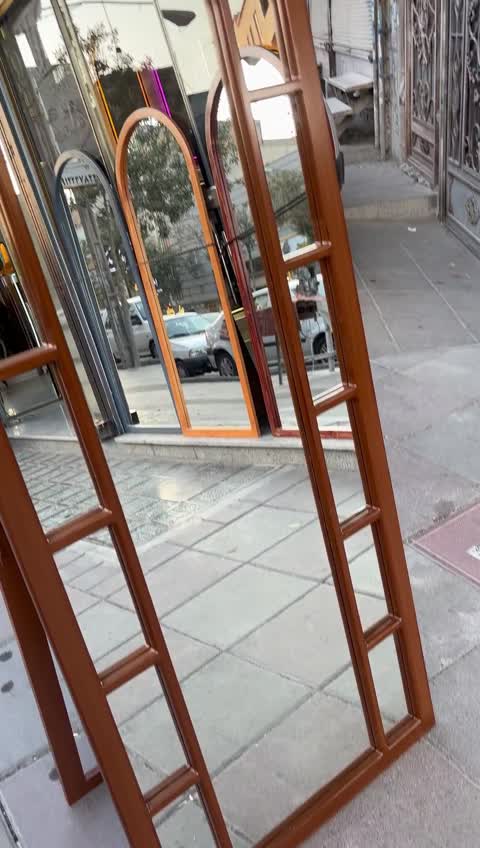 آیینه تمام قدی گنبدی پنجره ای پایه دار پایه به صورت تاشو از پشت جنس تمام mdf واناچای خام که کار به صورت تمام رنگ میباشد آیینه درجه یک پشت نقره با کیفیت و شفافیت بالا